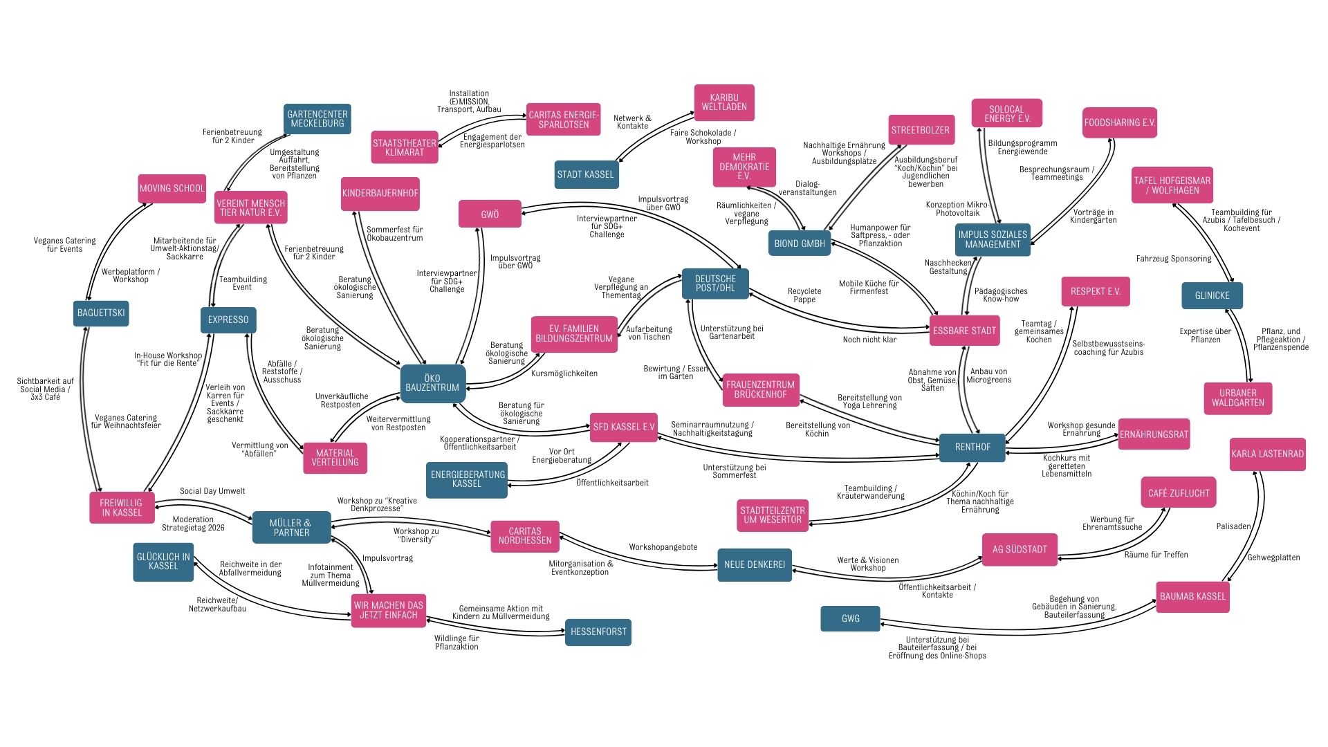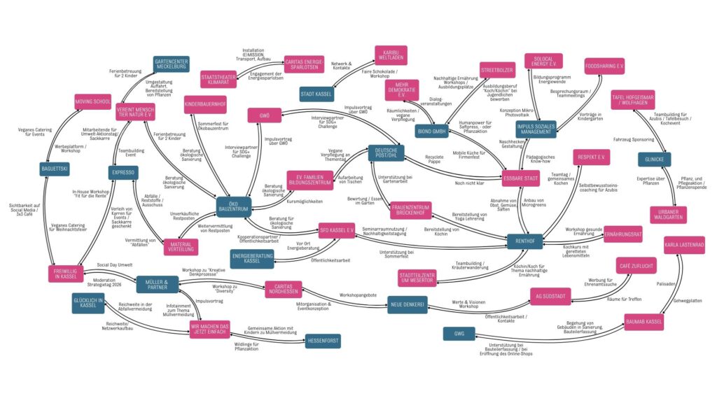 Die Vielfalt der Partnerschaften war bemerkenswert: Der Renthof Kassel und der Soziale Friedensdienst Kassel e.V. verbinden nachhaltige Festgestaltung mit sozialen Bildungsimpulsen; EXPRESSO Deutschland GmbH & Co. KG und die GemeinwohlÖkonomie Kassel verknüpfen eine Nachhaltigkeitschallenge mit einem Impuls zur werteorientierten Wirtschaft. Impuls Soziales Management & foodsharing Kassel tauschen Besprechungsräume für Teammeetings gegen Umweltbildung in Kindergärten und das ÖkoBauzentrum & der Kinderbauernhof kombinieren ökologische Bauberatung mit einem Sommerfest für Mitarbeitende. Solche Begegnungen zeigen, welche Kraft entsteht, wenn Engagement wirklich auf Augenhöhe passiert.